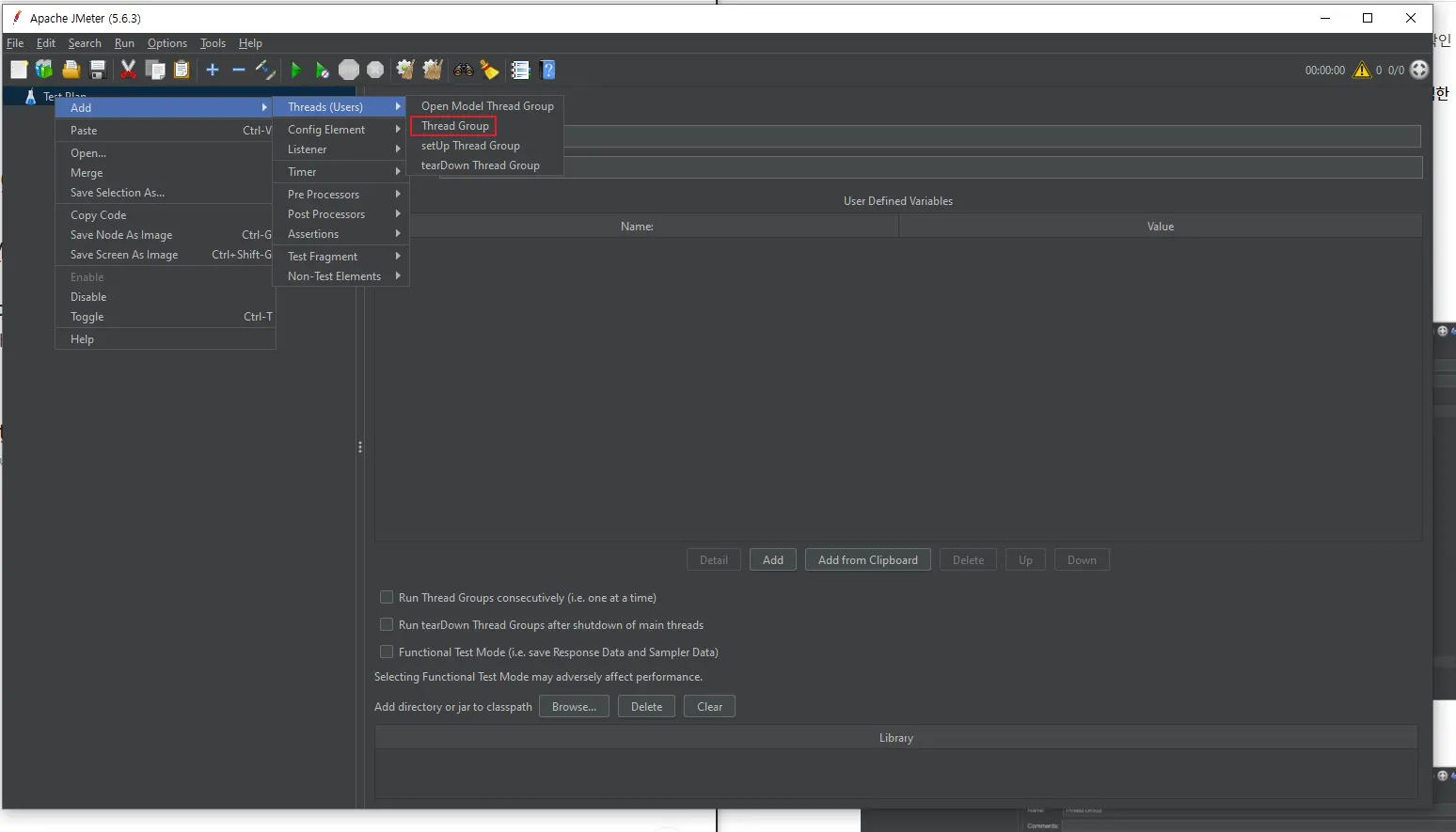 Test Plan을 우클릭하여 Add → Threads(Users) → Thread Group으로 들어간다.