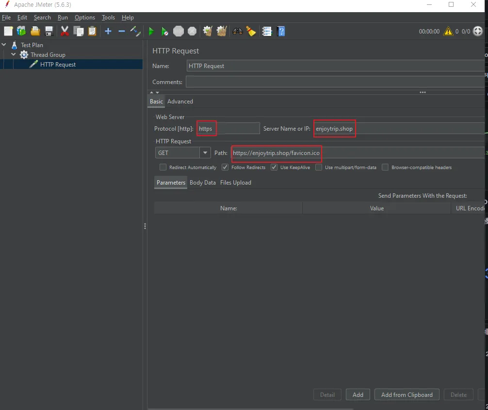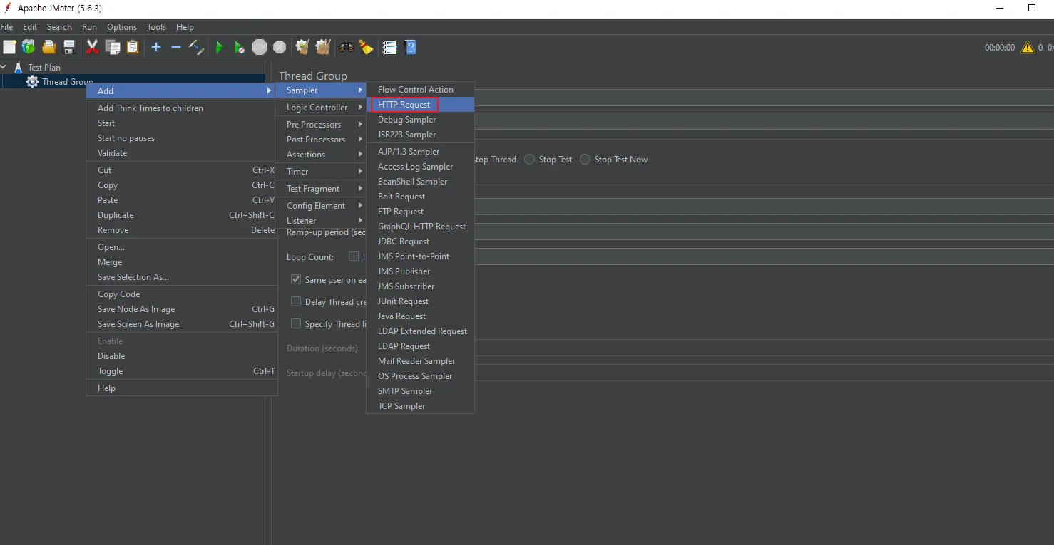 Threads Group 마우스 오른쪽 버튼을 눌러 HTTP Request를 선택