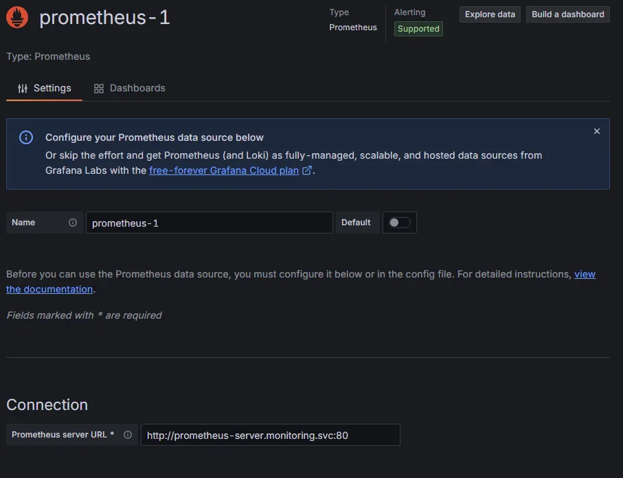 Connection에서 Prometheus의 Service와 연결해줍니다.