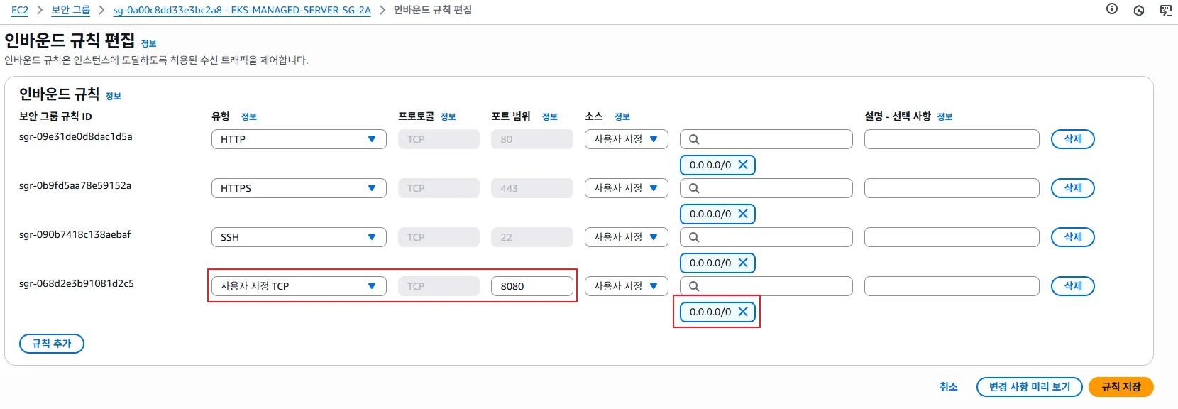 보안그룹 설정(managed-server) - 8080포트를 열기