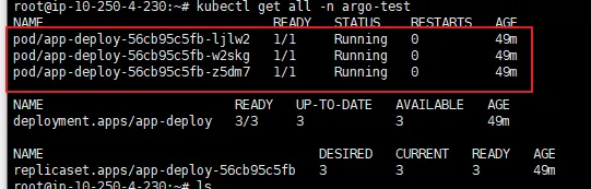실행 후 kubectl get all -n argo-test yaml파일에서 작성한 네임스페이스 를 통해 확인